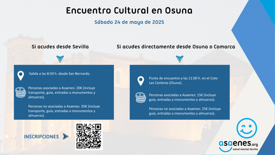 Con el objetivo de promover el fortalecimiento de redes para el apoyo social de familiares y personas en experiencia propia mediante su participación activa, Asaenes Salud Mental Sevilla organiza el próximo sábado 24 de mayo el primer Encuentro Cultural que tendrá lugar en Osuna.